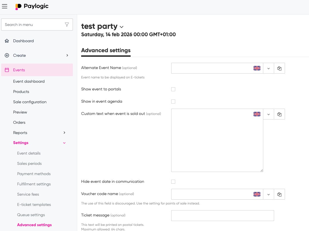 - In the menu on the left, go to "Settings" and then "Advanced settings". Under "Advanced settings" you can enter the alternative event name for the e-ticket.