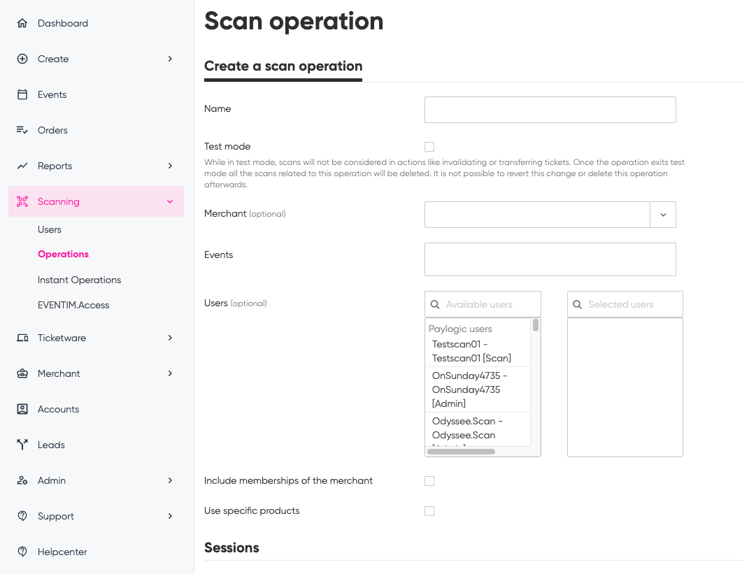 User access rights: For each created scan user, a scan session can be selected. Example: Scan staff that only scans on Friday only needs access to the Friday session. It is also possible to specify which entrances the specific scan user is allowed to select.
