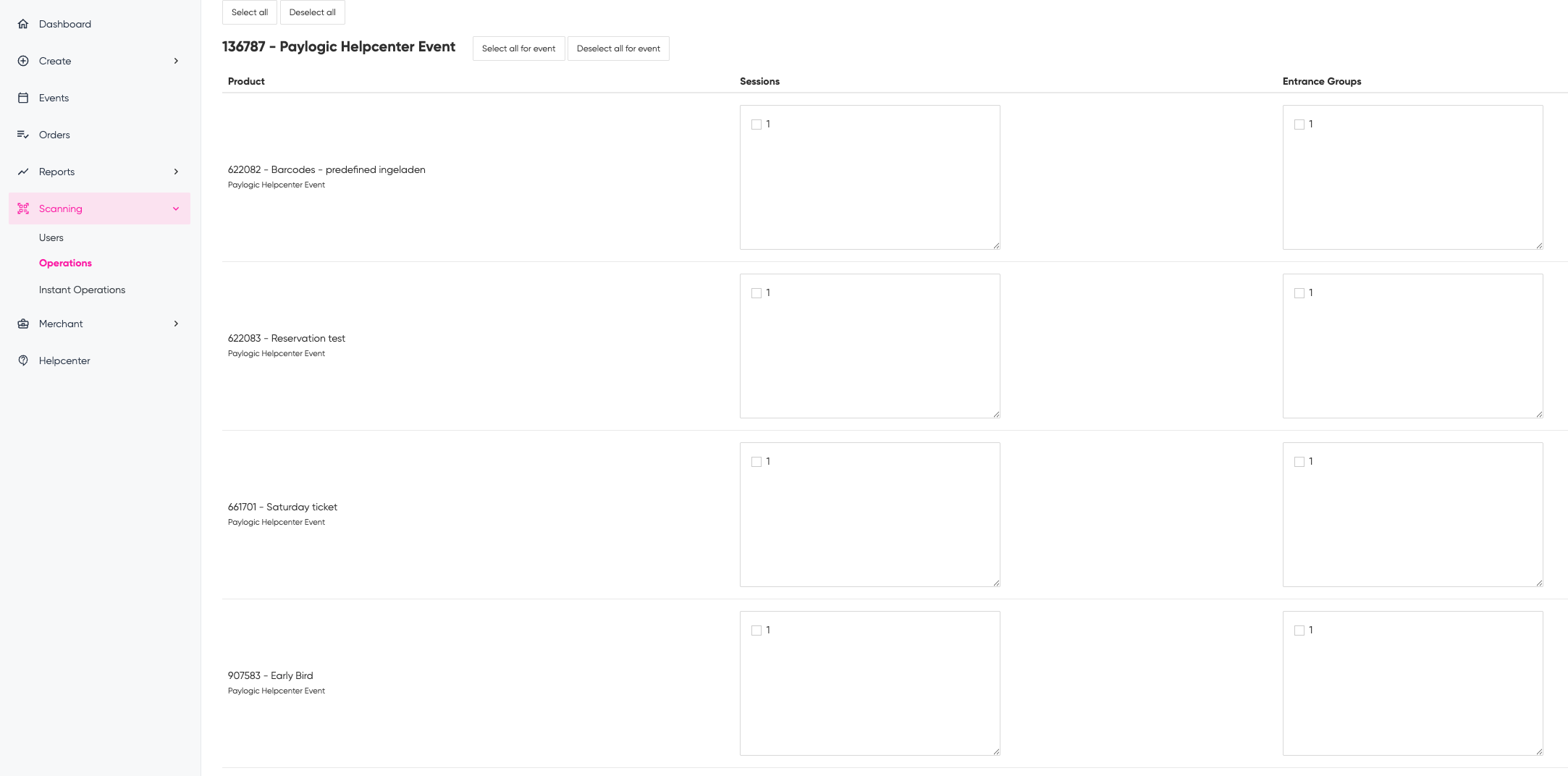 10. Now expand the 'Product configuration' section. Select which product may be scanned at which entrance. If all products can be scanned at all entrances or the only entrance, click 'Select all'. See below for more information about assigning products to entrances.