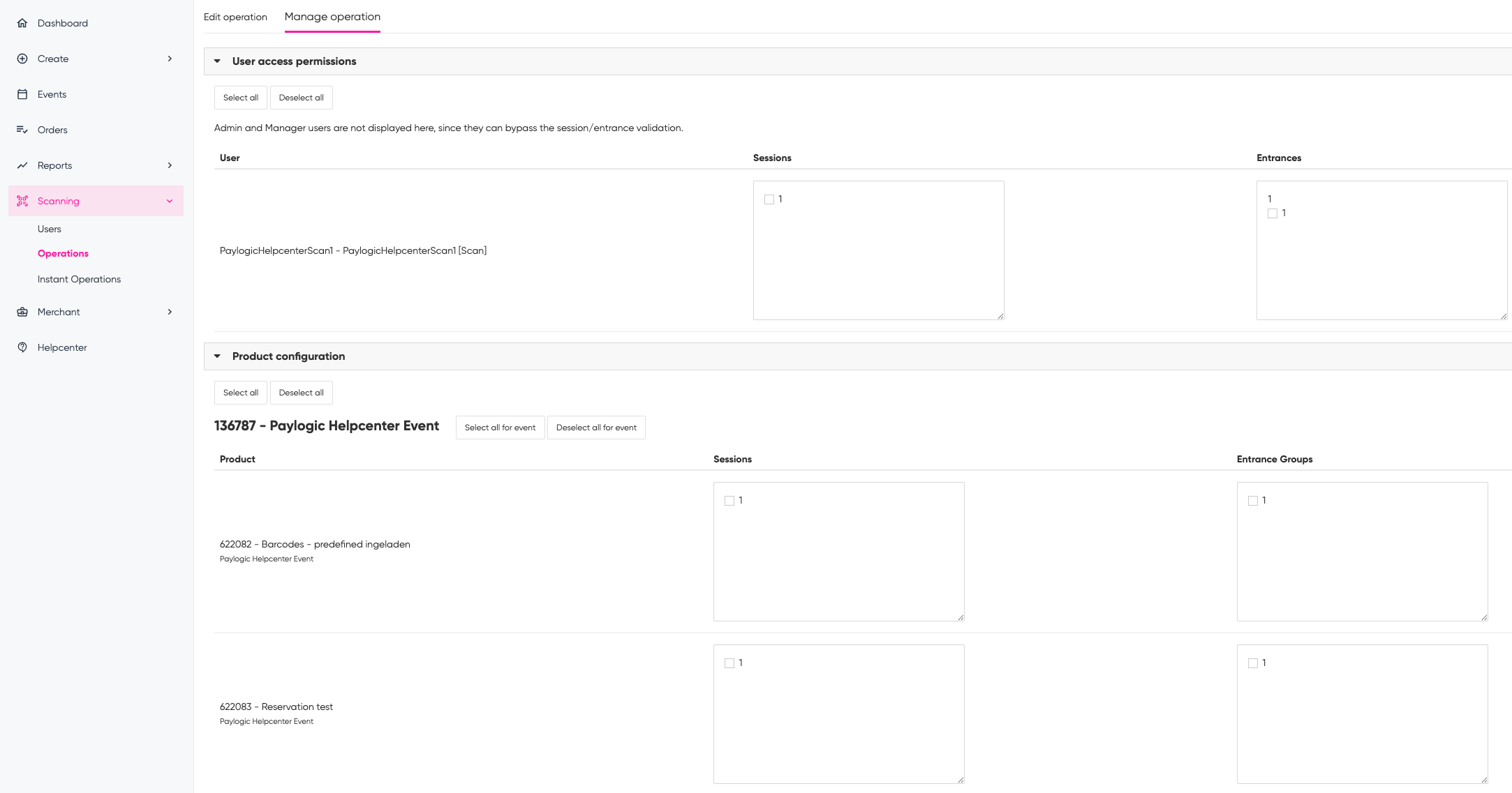 9. You are now on the next step 'Edit scan operation'. Here, select which user is allowed to scan which entrance. For admin and manage users, this selection is not necessary. They are allowed to scan all entrances and sessions where applicable. Read below for more information.