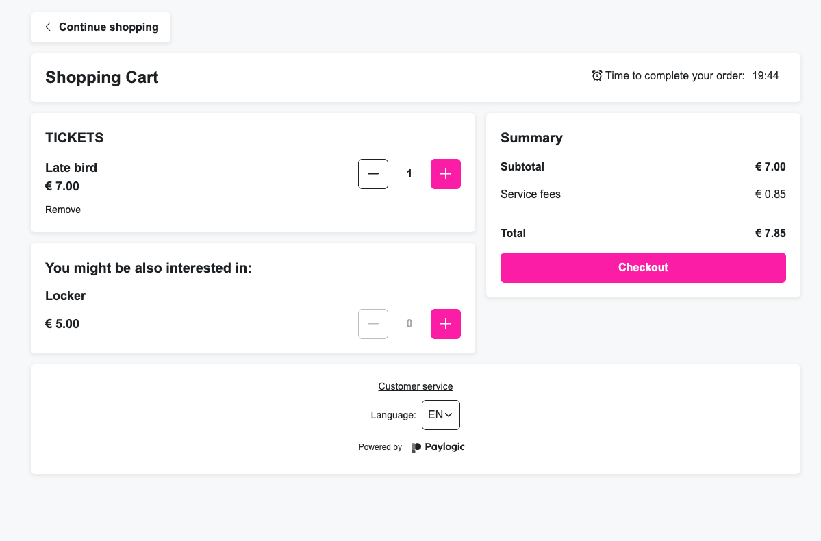 - Upsell at checkout – in this case, fans will see the upsell products when they have added products to their shopping cart. For example, a locker will be shown at checkout if there is only an entrance ticket in the shopping cart.