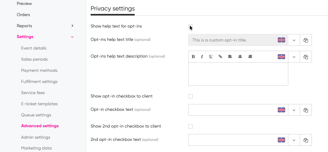 By using opt-ins, fans can give their consent for, for example, subscribing to a newsletter, storing data, or subscribing to information that you as an organization would like to share with fans. The content of the opt-in itself is up to you and can be adjusted. If fans agree to the opt-in, they give their permission to be included in promotional communication towards fans. You can set up the opt-in for all events within the account, or create a separate opt-in per event.