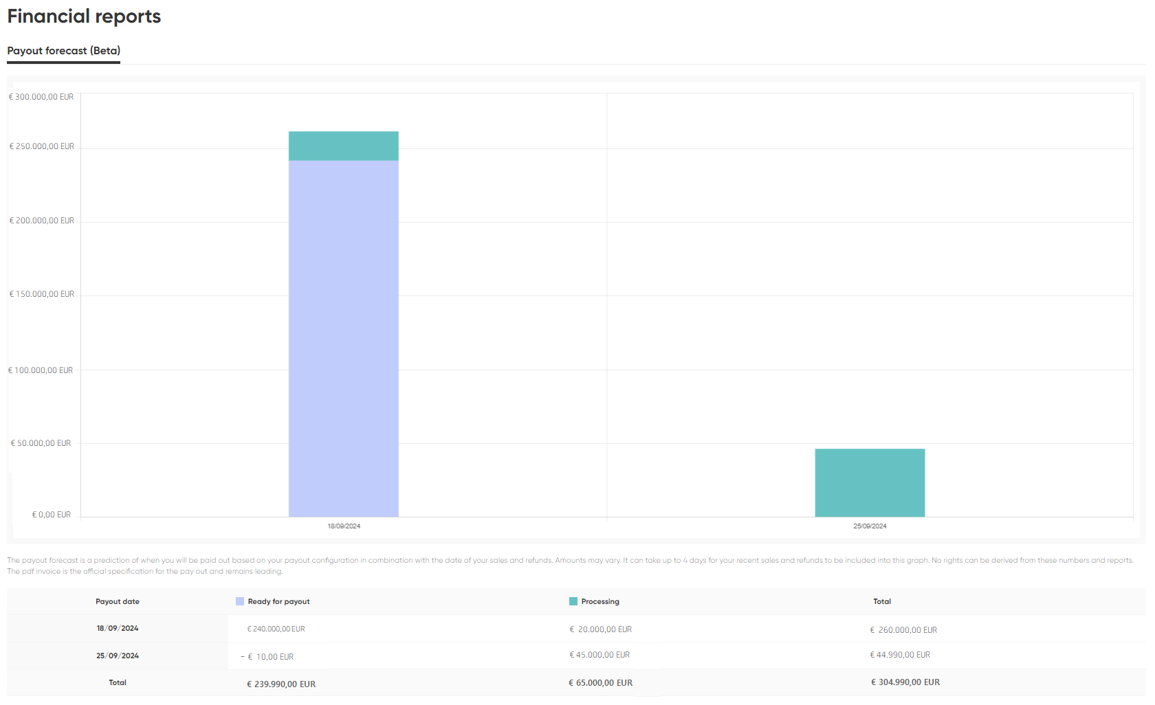 The payout forecast provides an estimate of when you will receive your payments, based on your payout configuration in combination with the dates of your sales and refunds. Please note that amounts may vary. It may take up to four days for your most recent sales and refunds to appear in this chart. No rights can be derived from these figures or reports. The PDF invoice serves as the official specification for the payout and remains the leading document