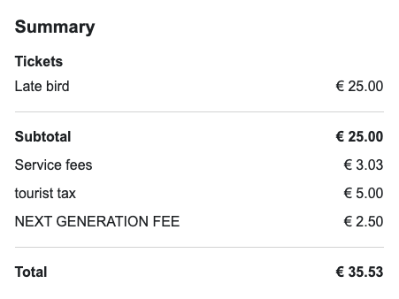 Apart from the ticket price and service fee, it may be necessary to charge additional costs, for example tourist tax or a deposit. With the custom fee solution, additional costs can be added separately per product, and these are shown in a clear way both to the consumer and on the settlement invoice.