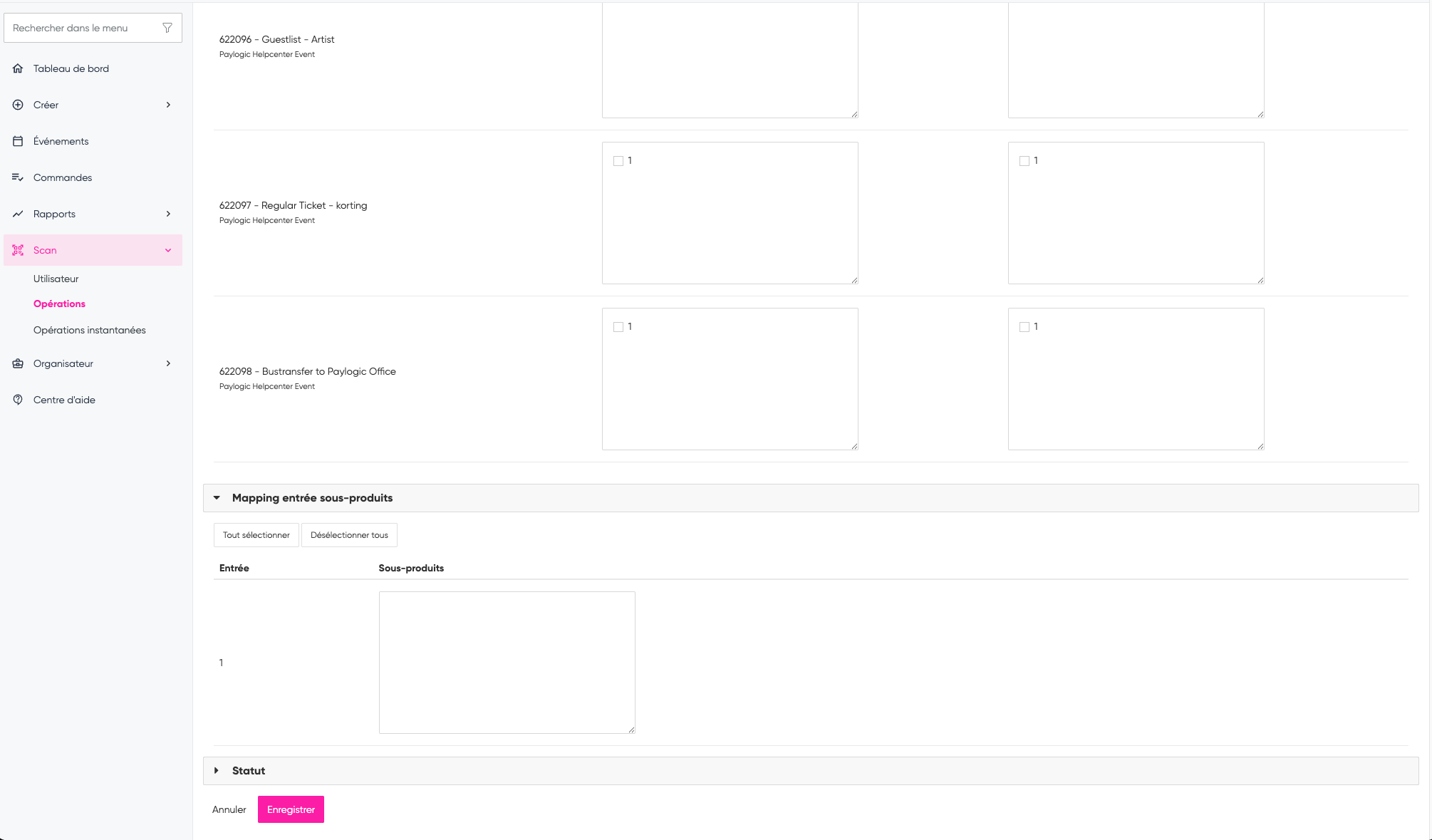 9. Vous êtes maintenant à l'étape suivante « Modifier l'opération de scan ». Sélectionnez ici quel utilisateur est autorisé à scanner quelle entrée. Cette sélection n'est pas nécessaire pour les utilisateurs admin et manage. Ils sont autorisés à scanner toutes les entrées et sessions lorsque cela s'applique. Lisez ce qui suit pour plus d'informations.