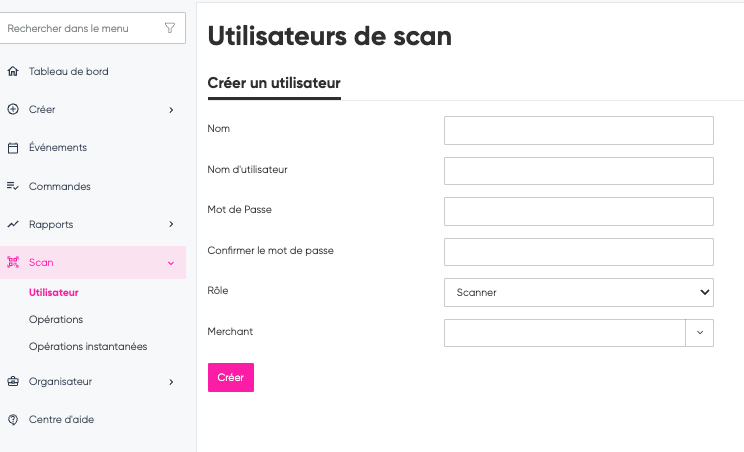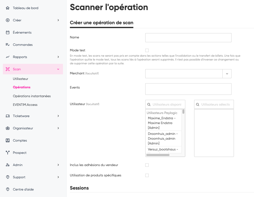 Droits d'accès utilisateur : une session de scan peut être sélectionnée pour chaque utilisateur de scan créé. Exemple : le personnel de scan qui ne vient scanner que le vendredi n'a besoin d'avoir accès qu'à la session du vendredi. Il est également possible d'indiquer les entrées que l'utilisateur de scan spécifique peut choisir.