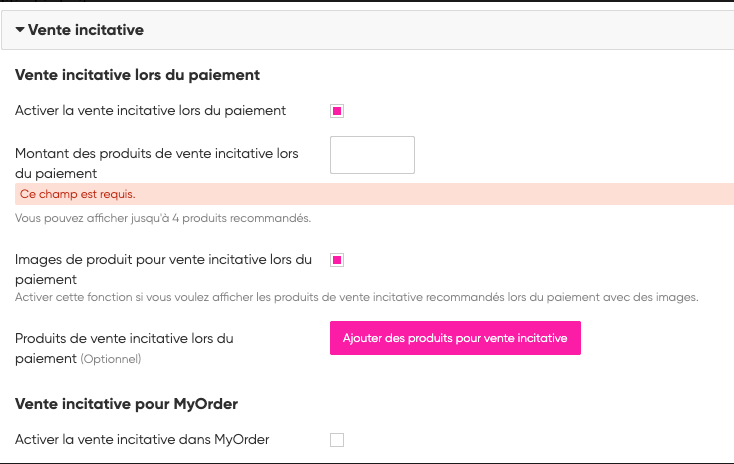 - Cochez également 'Activer la vente additionnelle dans MyOrder'. Ajoutez ici la chaîne de vente que vous avez créée pour la vente additionnelle.