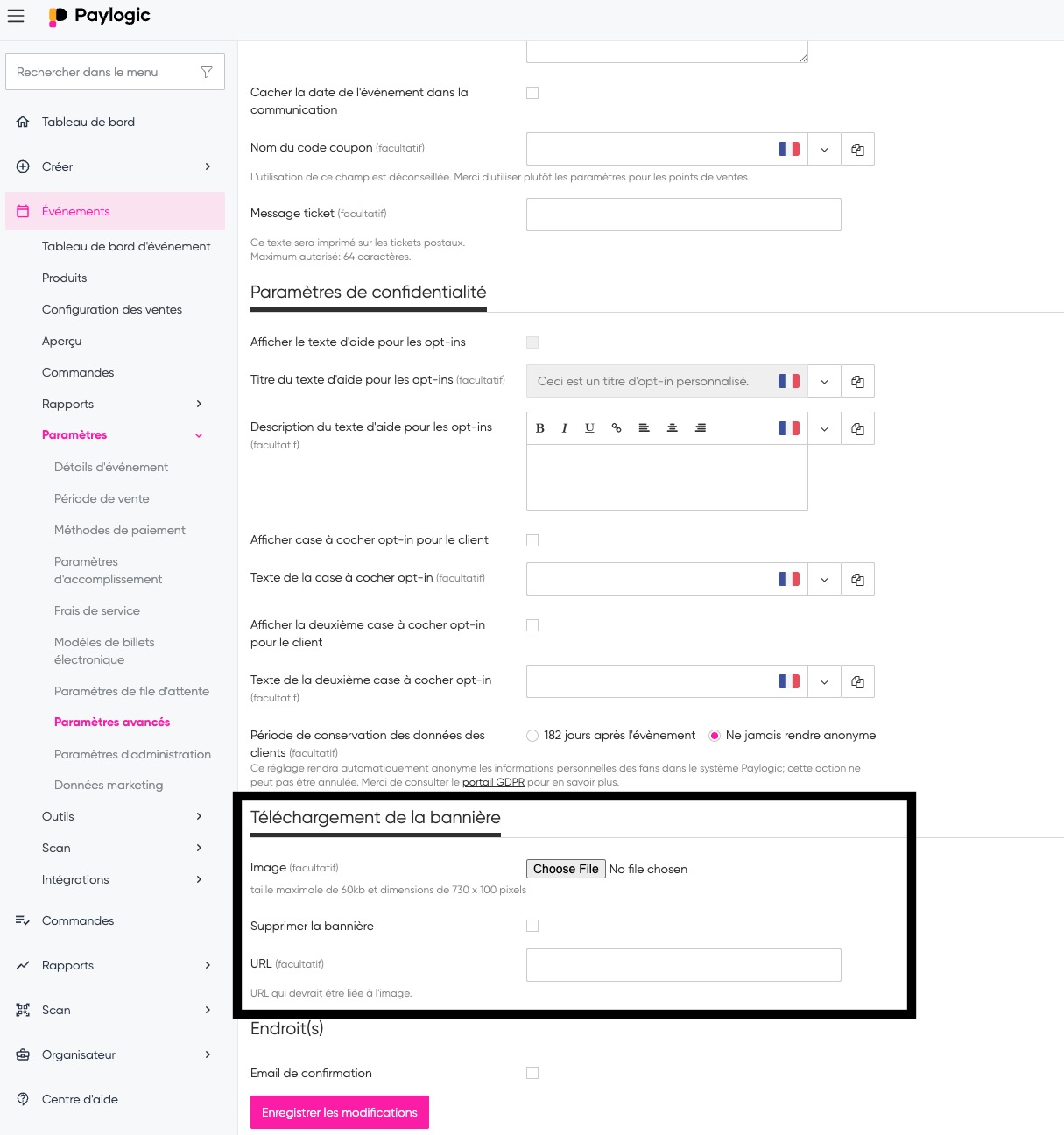 Ajoutez une bannière à la page de confirmation de votre boutique afin de rediriger vos clients vers votre site web, vos réseaux sociaux ou votre newsletter. Allez dans 'Tableau de bord' et sélectionnez l'événement souhaité. Cliquez sur 'Configuration ...