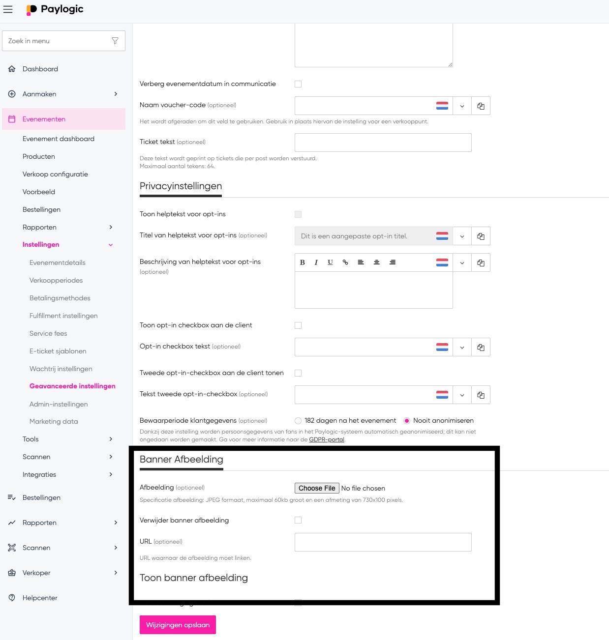 Een bevestigingsbanner is een banner die de fan terugziet op de bevestigingsmail. Deze banner kan ingezet worden om je branding vertalen naar de bevestigingsmail. Volg voor het instellen van de banner de onderstaande stappen: